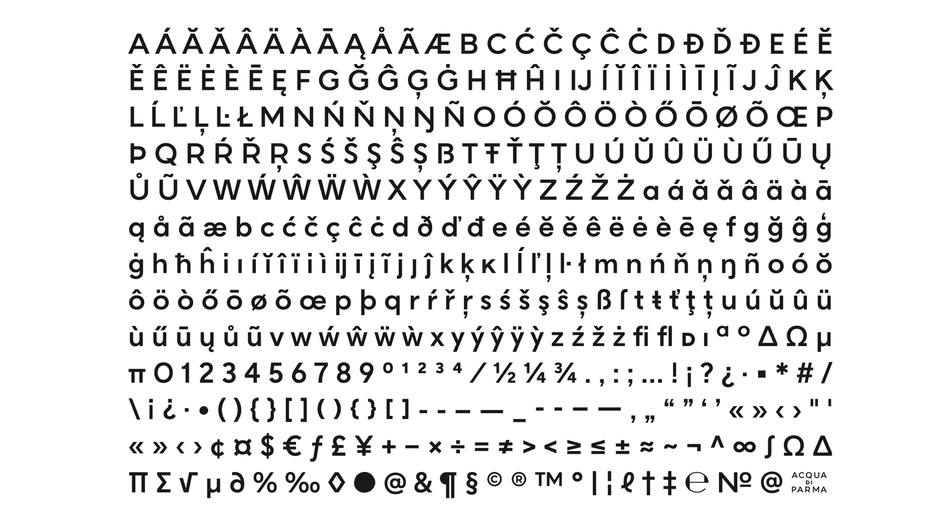 Transforming Acqua di Parma’s iconic logotype into a full sans serif typeface was no small task. The challenge lay in crafting something timeless and classical, while staying true to the character of the brand. As always, the devil is in the details.